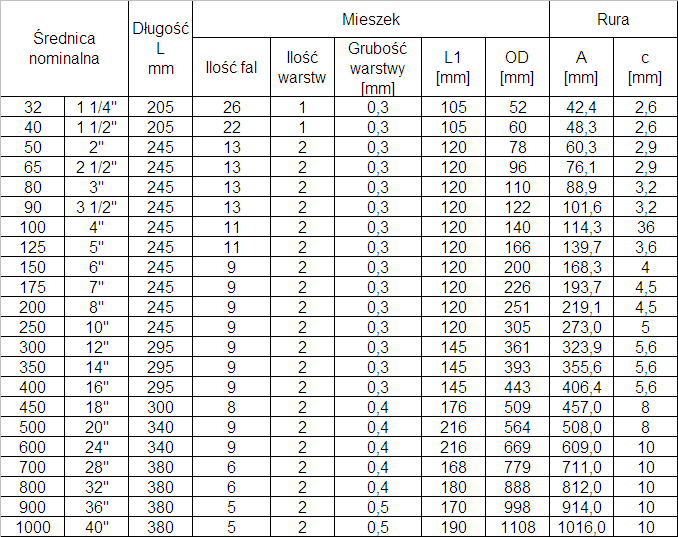 Uwaga: Poniższa tabela wymiarów uwzględnia wyłącznie rozwiązania typowe z katalogu. Na zamówienie wykonujemy kompensatory według dostarczonej dokumentacji.